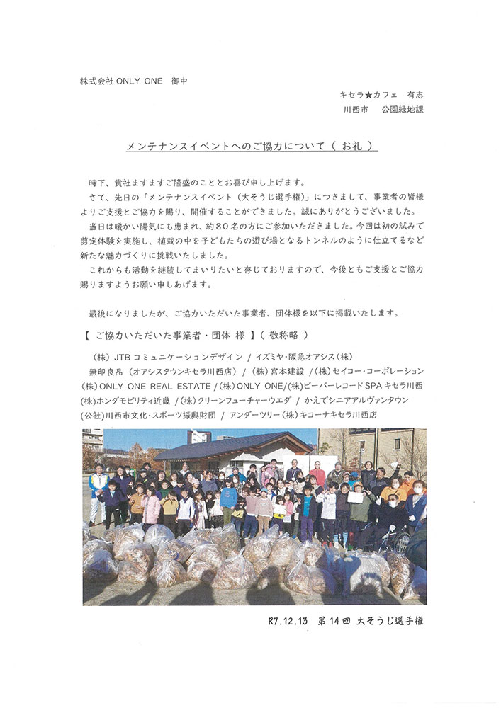 2025.12.19 おしらせ お礼状をいただきました 去る12月13日(土)に開催され、弊社も参加させていただきました、『第14回大そうじ選手権』につきまして、川西市 公園緑地課 様よりお礼状をいただきましたので、ご報告させていただきます。 当日はとても暖かく、またとない”大そうじ日和”でした。有志で集まった地元の住人のみなさんや、企業のみなさんに交じって、およそ1時間の大そうじで、広い公園があっという間にきれいになりました。 次回は来年の7月になりますが、また参加させていただきたいと思います。