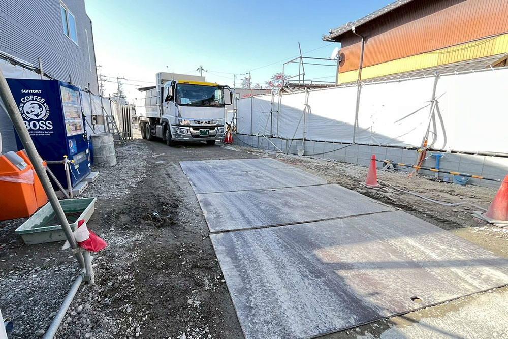基礎のコンクリート工事は終了し、現在は地中に埋設する配管工事や、土の埋め戻しなどが行われています。